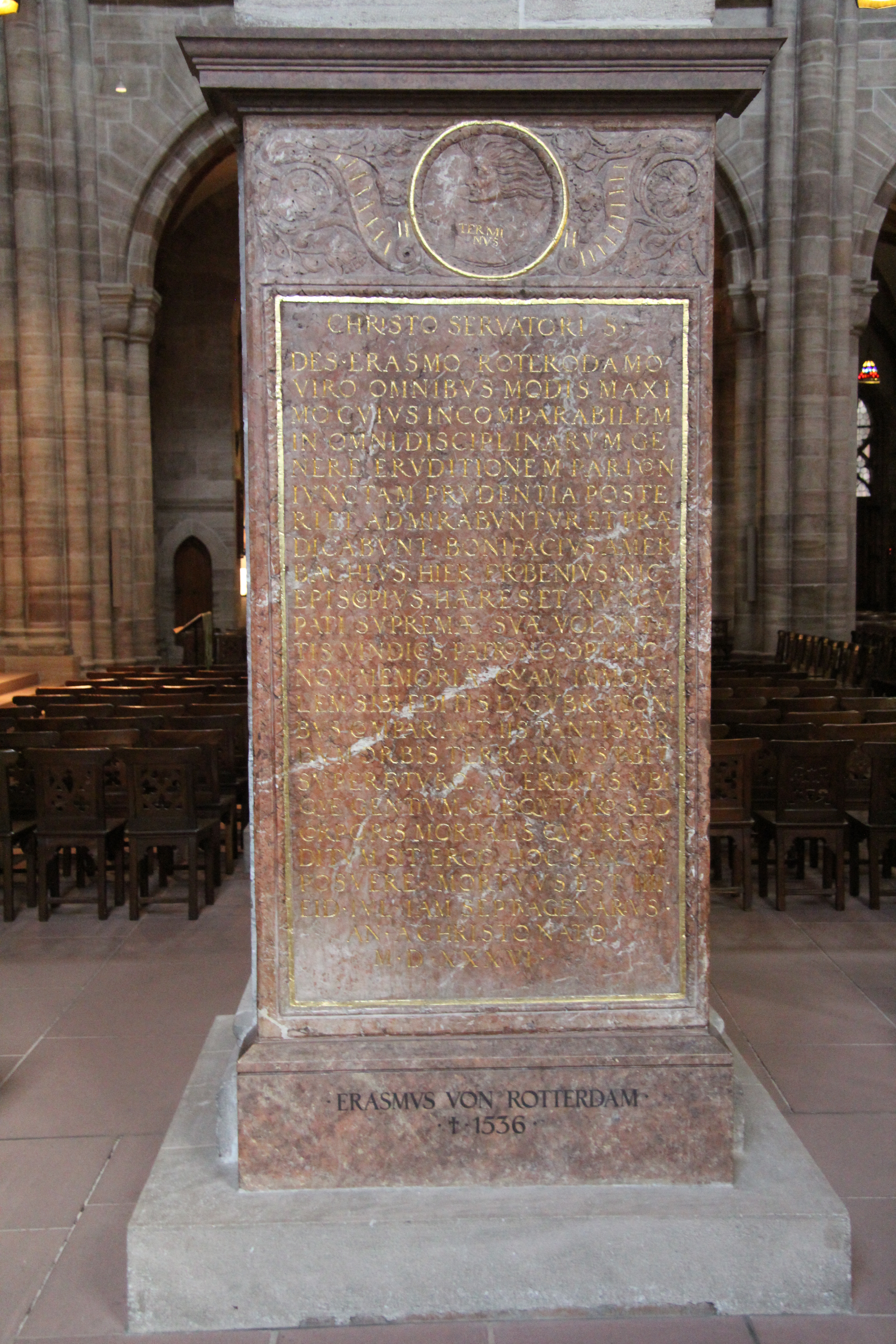 Desiderius Erasmus werd geboren in Rotterdam op 28 oktober 1466, 1467 of 1469. Hij stierf in Bazel op 12 juli 1536, en zijn graf bevindt zich in de kathedraal Basler Münster. Zijn grafsteen is versierd met een inscriptie ter nagedachtenis aan hem.