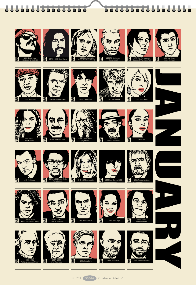 Het portret hierboven en de muzikale verjaardagskalender / naslagwerk met 366 world famous musician,