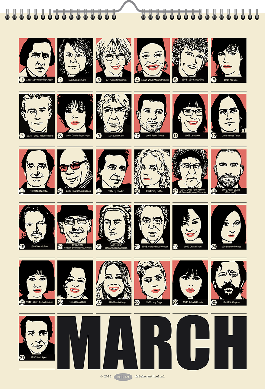 Het portret hierboven en het muzikale naslagwerk / verjaardagskalender