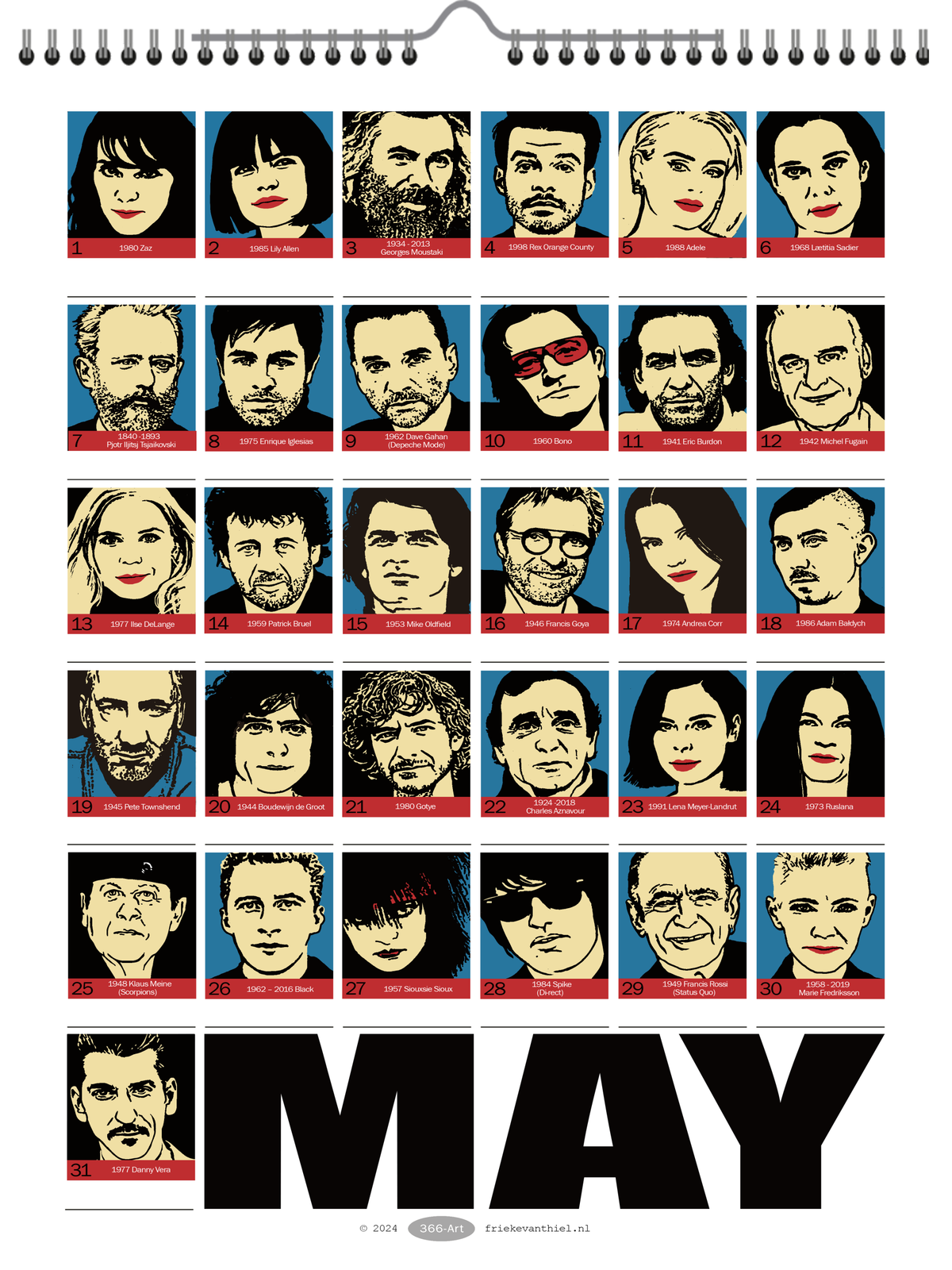 Muzikaal naslagwerk in de vorm een verjaardagskalender met 366 portretten van muzikale artiesten uit verschillende muziekgenres, zoals rock, pop, jazz, klassiek, R&B, hiphop, country, elektronisch en een aantal sub genres. Door dit brede scala aan muzikale artiesten biedt deze kalender een inspirerende en exclusieve ervaring voor muziekliefhebbers. Samengesteld door music lovers en kenners, made by me. ©, Frieke