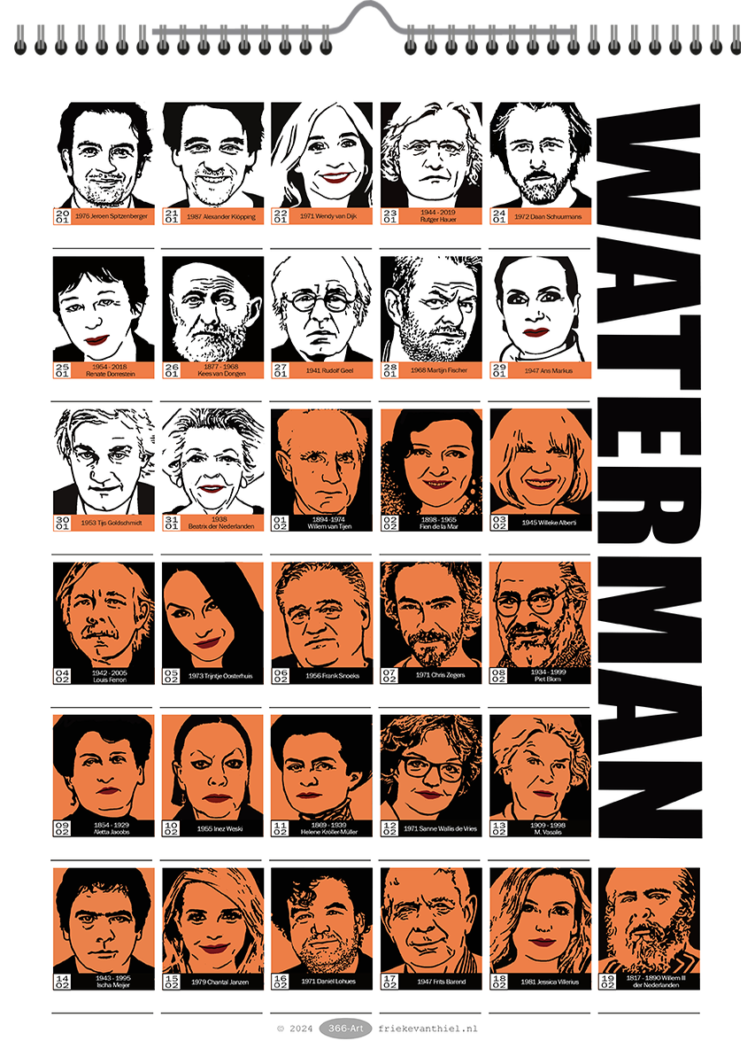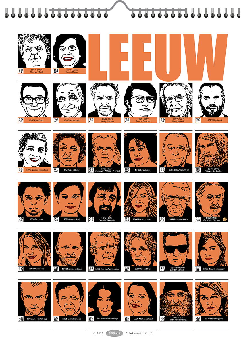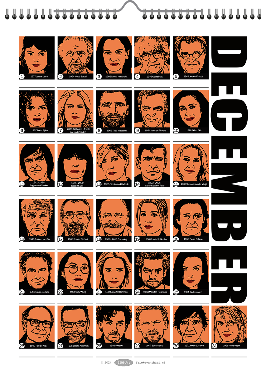 366 Portretten van inspirerende, legendarische en bekende Nederlanders waaronder musici, wetenschappers, kunstenaars, politici, sporters, schrijvers en andere bekende personen. Een jaar vol Nederlandse inspiratie! Kom op een originele meer te weten over de geschiedenis en cultuur van Nederland door te googlen over de successen en de impact van deze personen op de samenleving. Vergeet nooit meer een verjaardag door zelf de namen toe te voegen van je favoriete mensen. Deze verjaardagskalender is een klein eerbetoon aan degenen die het verschil hebben gemaakt in ons land en die ons blijven inspireren om grootse dromen na te jagen. Alle portretten op deze verjaardagskalender zijn made by me © , Frieke